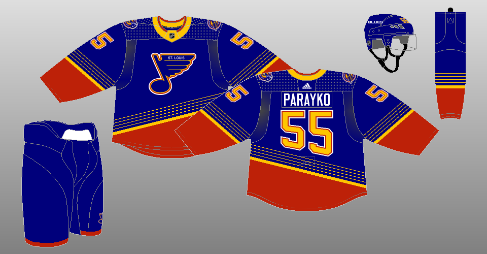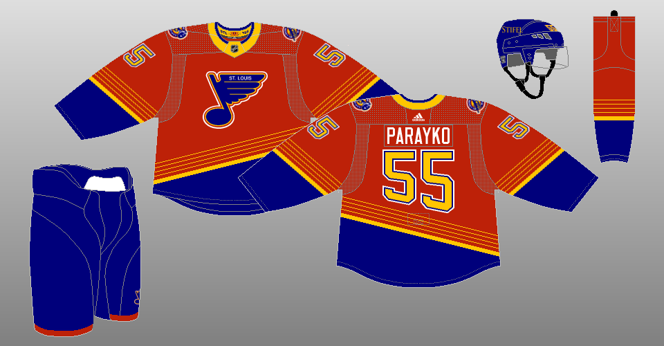 2021 Reverse Retro The Blues go red, going with a recolored version of their 1995-98 road uniforms for their Reverse Retro set. |