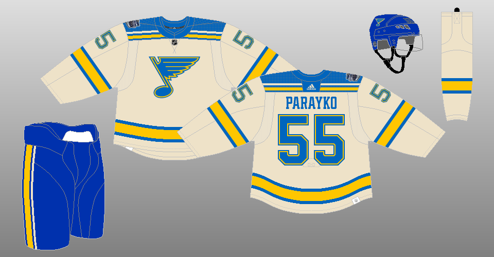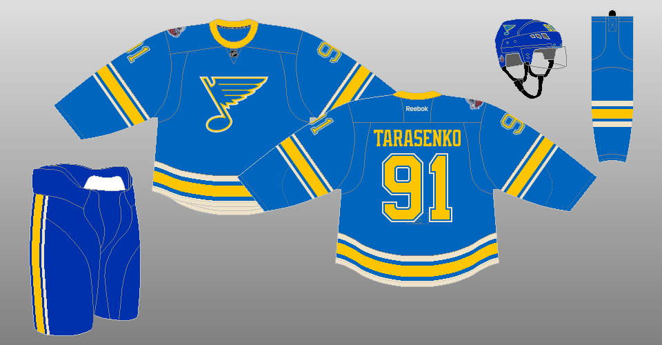 2025-present The Blues' new uniforms of 2025 were inspired by their Winter Classic uniforms of 2017 and 2022 (and, in effect, their inaugural uniforms), although they are not carbon copies of them. The Blues are retaining their former primary home uniform as their alternate for at least one more season, presumably so that they can clear out their old stock of their old retail home jerseys without discounting them. You know, money and stuff. |