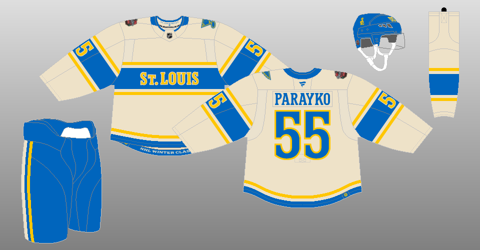2025 Winter Classic The Blues' Winter Classic uniform for 2025 (the game was actually played New Year's Eve, with the calendar still in 2024) is designed after the uniforms of the old St. Louis Flyers of the 1930s, colored in the team's original color palette of the 1960s. |
