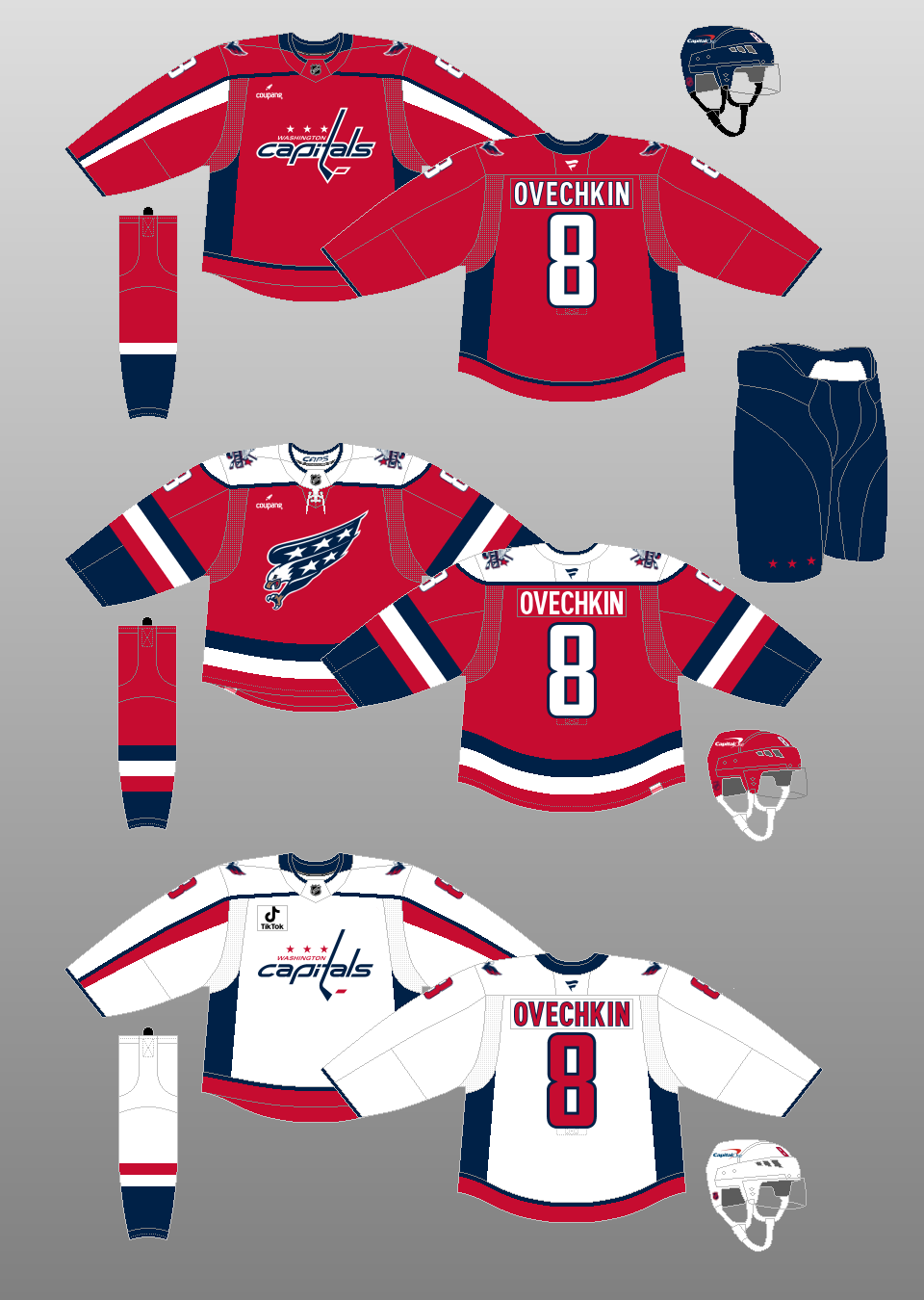 2025-present The Capitals introduce a new alternate home uniform, which is essentially a mashup representing all eras in franchise history, with the Screaming Eagle front and center. |