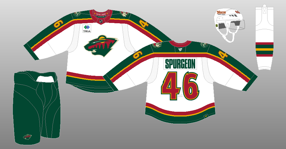 2013-17 The Wild replace their road uniform with one that better ties in with the theme of their home and alternate uniforms, albeit not matching them completely. |