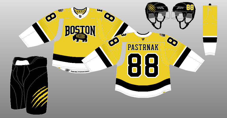 2026 Stadium Series With the Bruins traveling to Tampa, Florida, for the 2026 Stadium Series, they go with a brighter shade of yellow for their special sun-themed uniforms. |