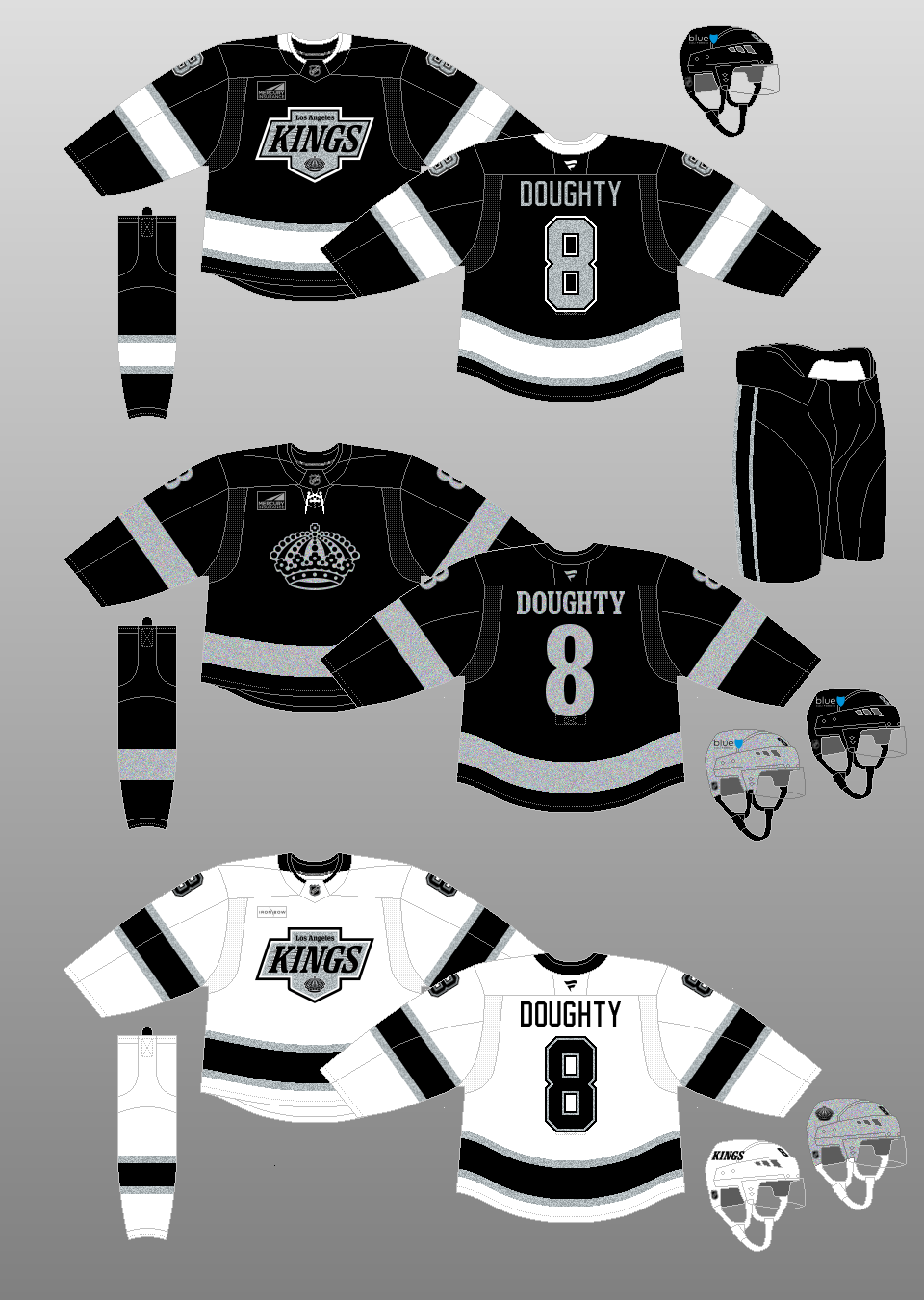 2025-present The Kings surprise everyone at the start of their 2025-26 season opener by taking the ice wearing new alternate uniforms, completely devoid of white and featuring silver helmets. The Kings never hinted at a new alternate uniform all off-season long. |
